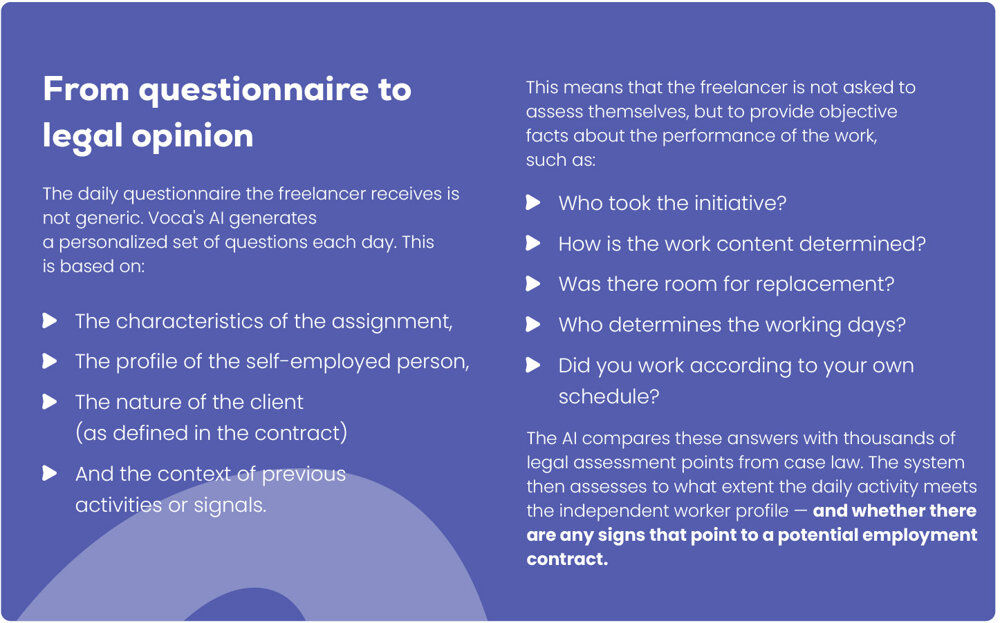 These elements include the degree of authority, organizational embedding, freedom of substitution, how assignments are acquired and carried out, and the entrepreneurial character of the professional. Instead of assessing these criteria manually, in advance, or periodically, Voca uses AI to evaluate these elements daily and automatically, based on the freelancer’s actual working day.
